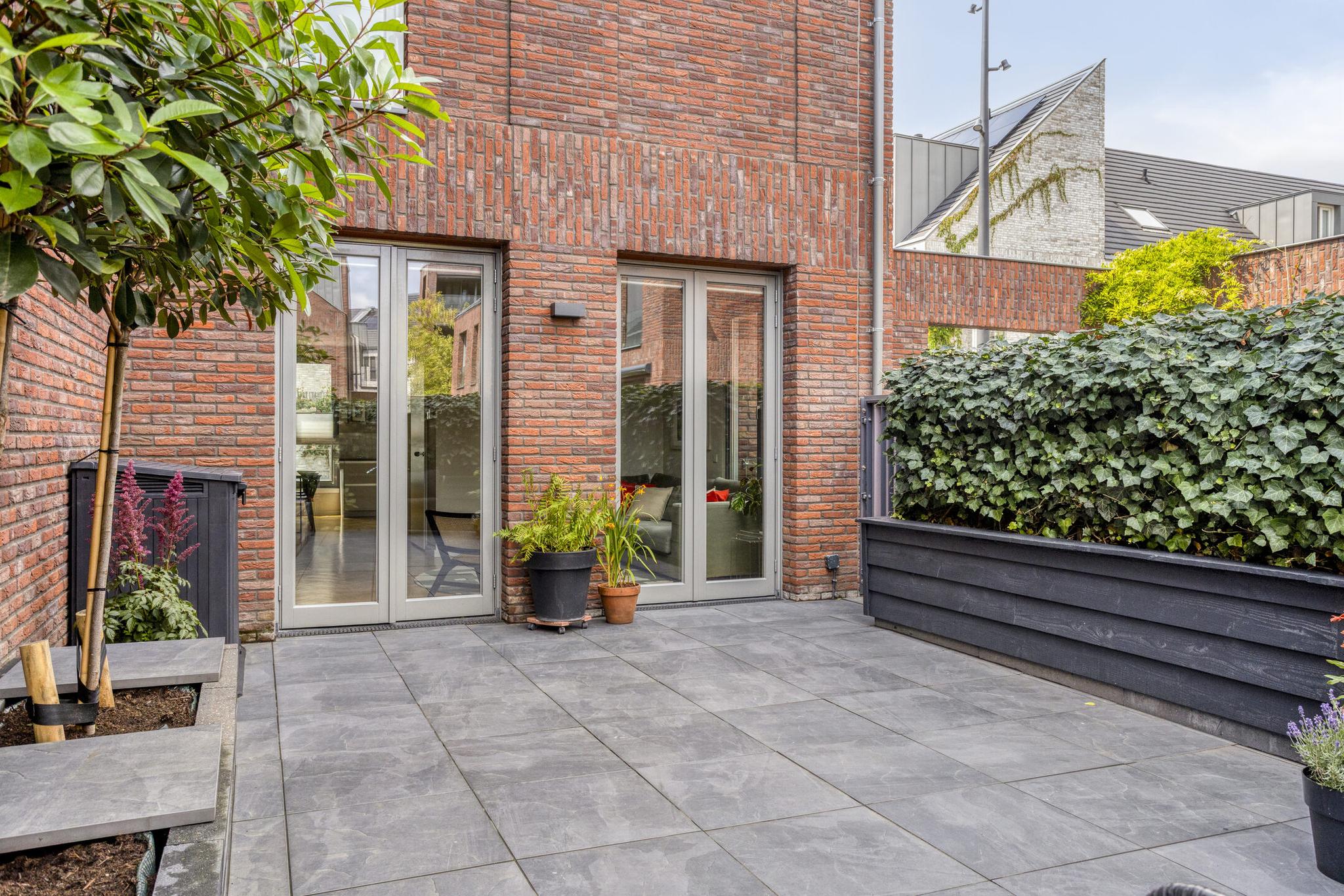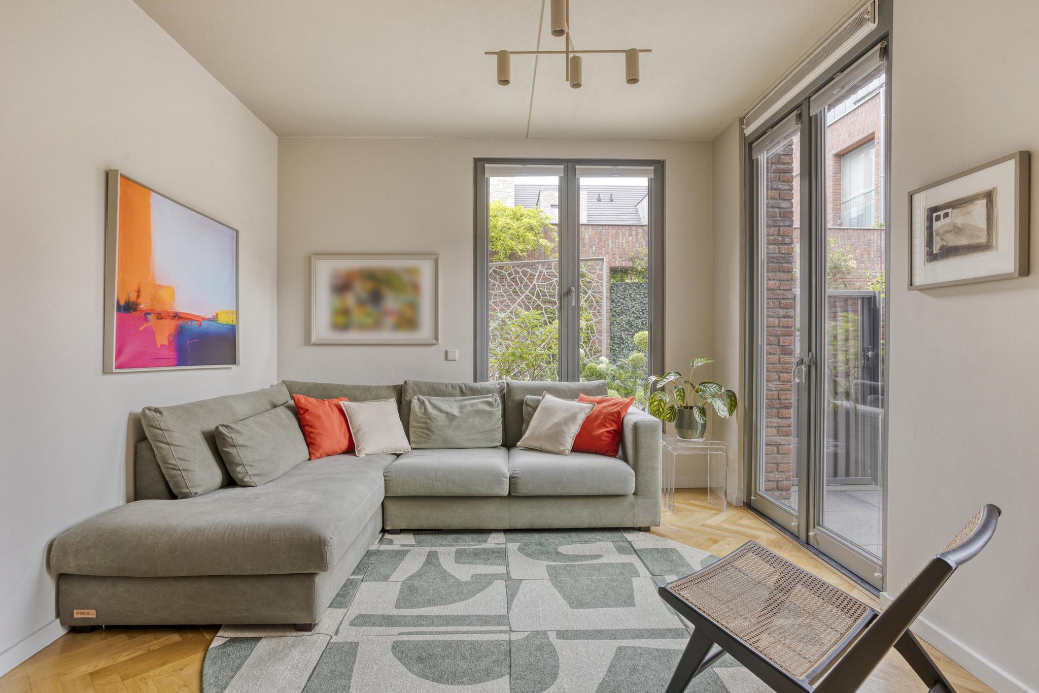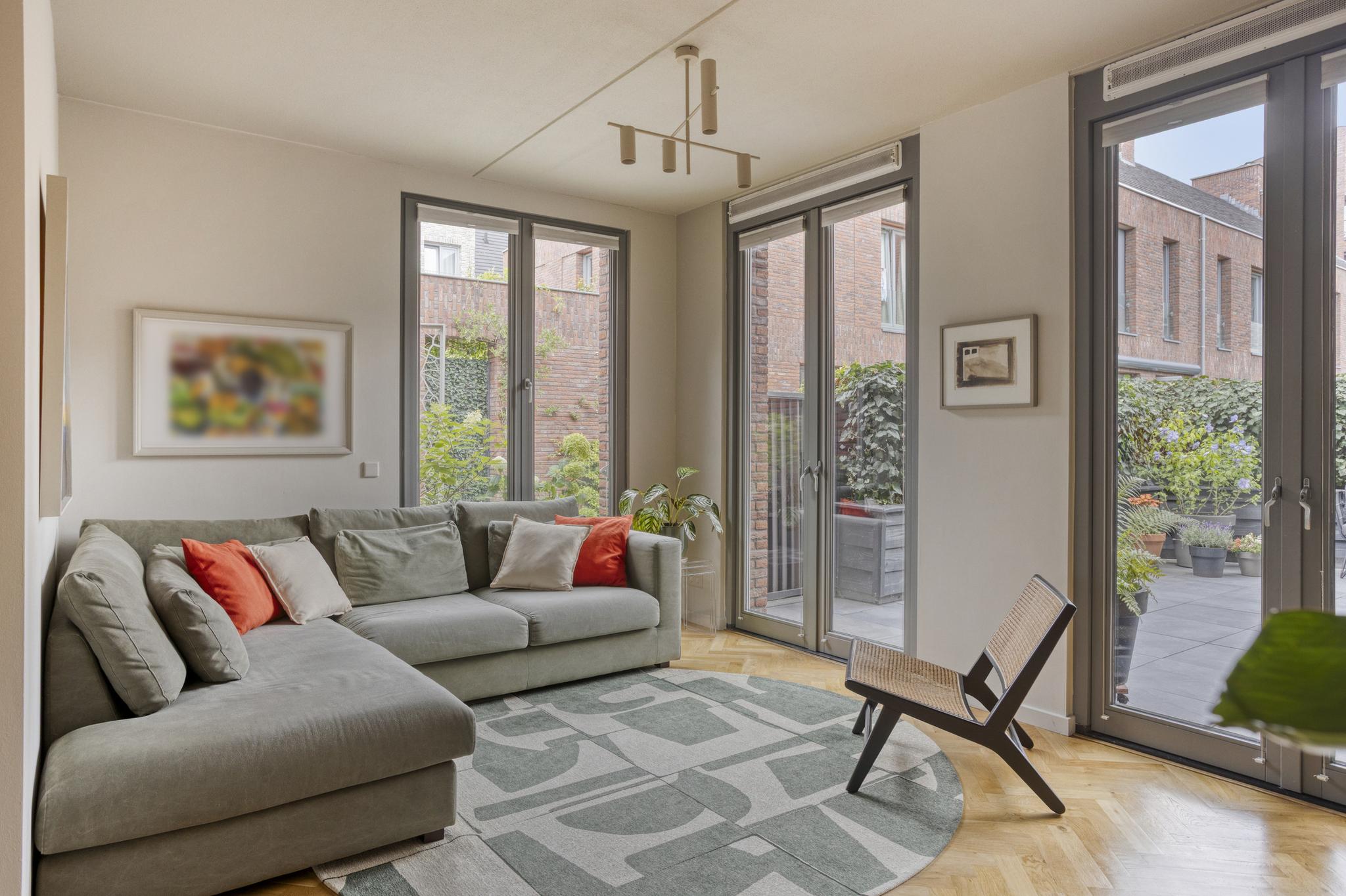 De woning kenmerkt zicht door de vele raamkozijnen, zo ook de vier openslaande deuren naar de tuin.