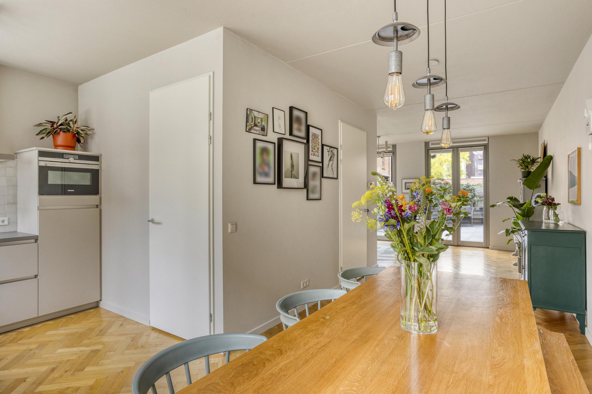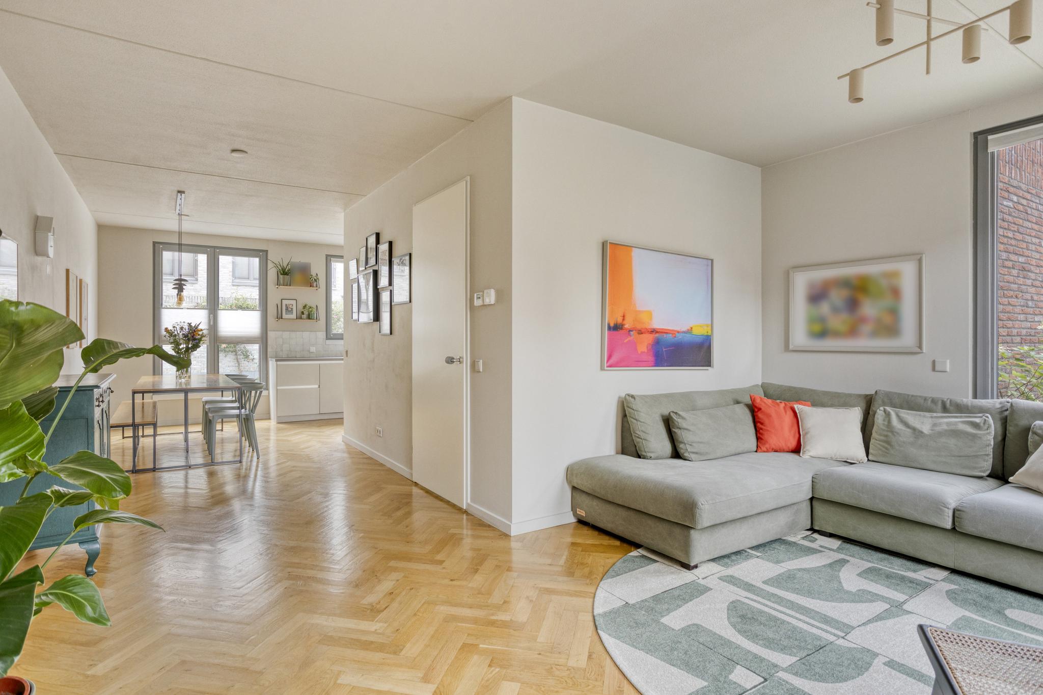 De woonkamer (27m²) is v.v. een keurige massieve parketvloer in visgraat motief gelegd en een nette wandafwerking.