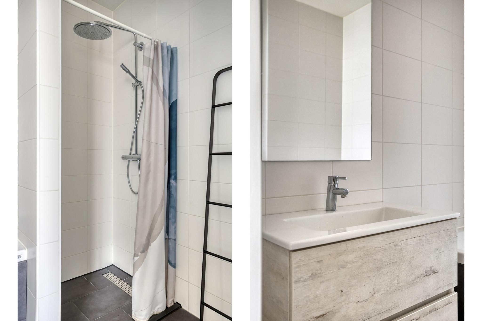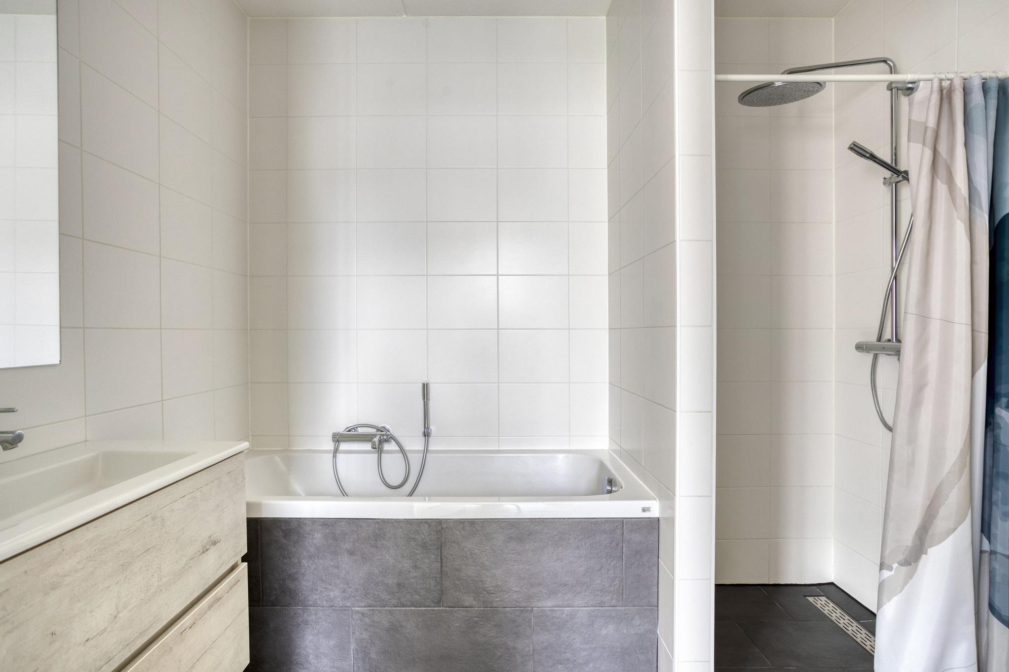 De inpandig gelegen badkamer (5,5m²) beschikt over een inloopdouche, ligbad en wasmeubel met wastafel.