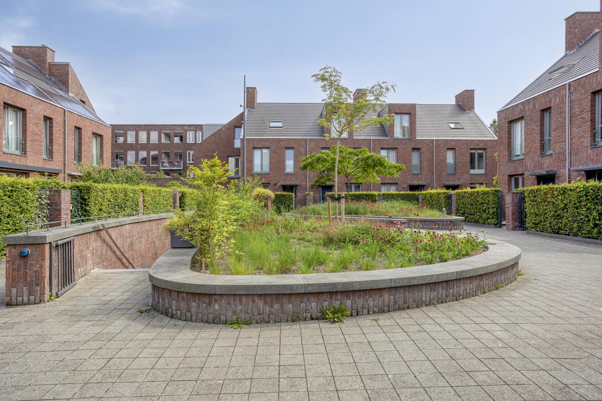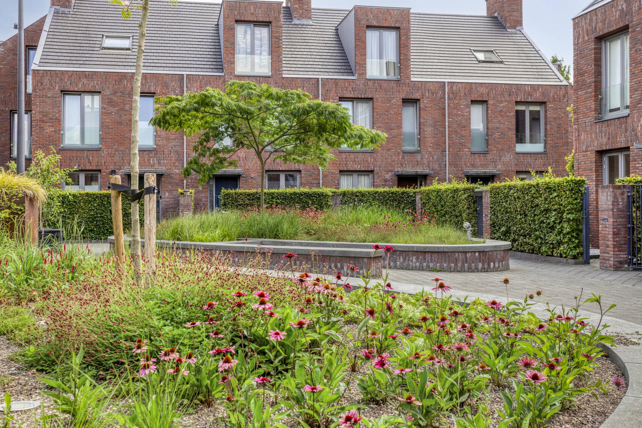 Een groene omgeving aan de achterzijde van de omliggende woningen met hun achtertuinen.