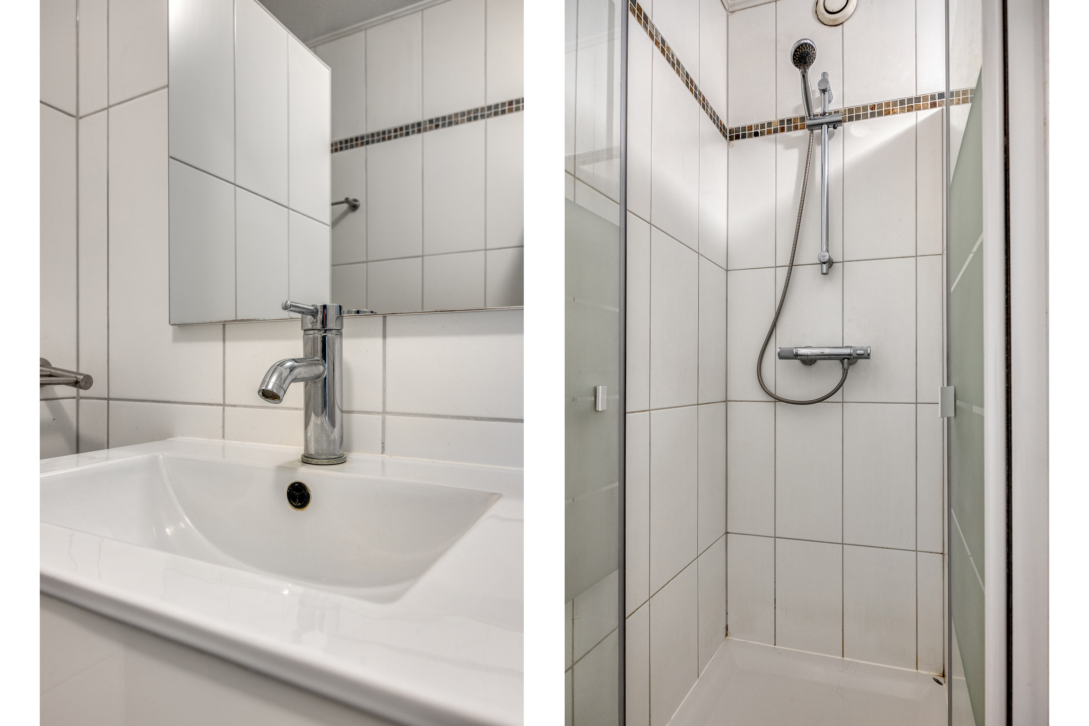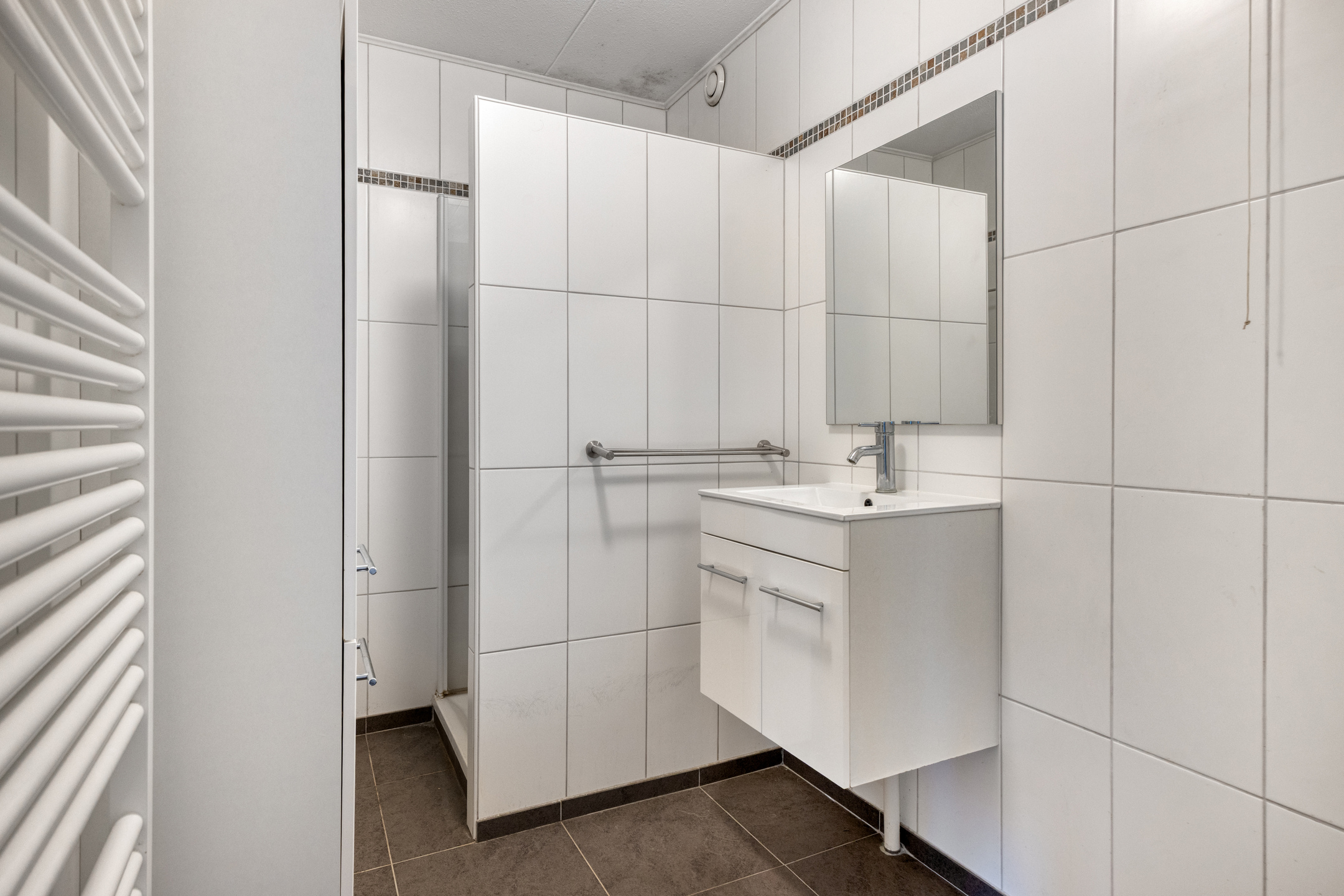 De badkamer (4,3 m²) is geheel betegeld en voorzien van een douche met mengkraan,