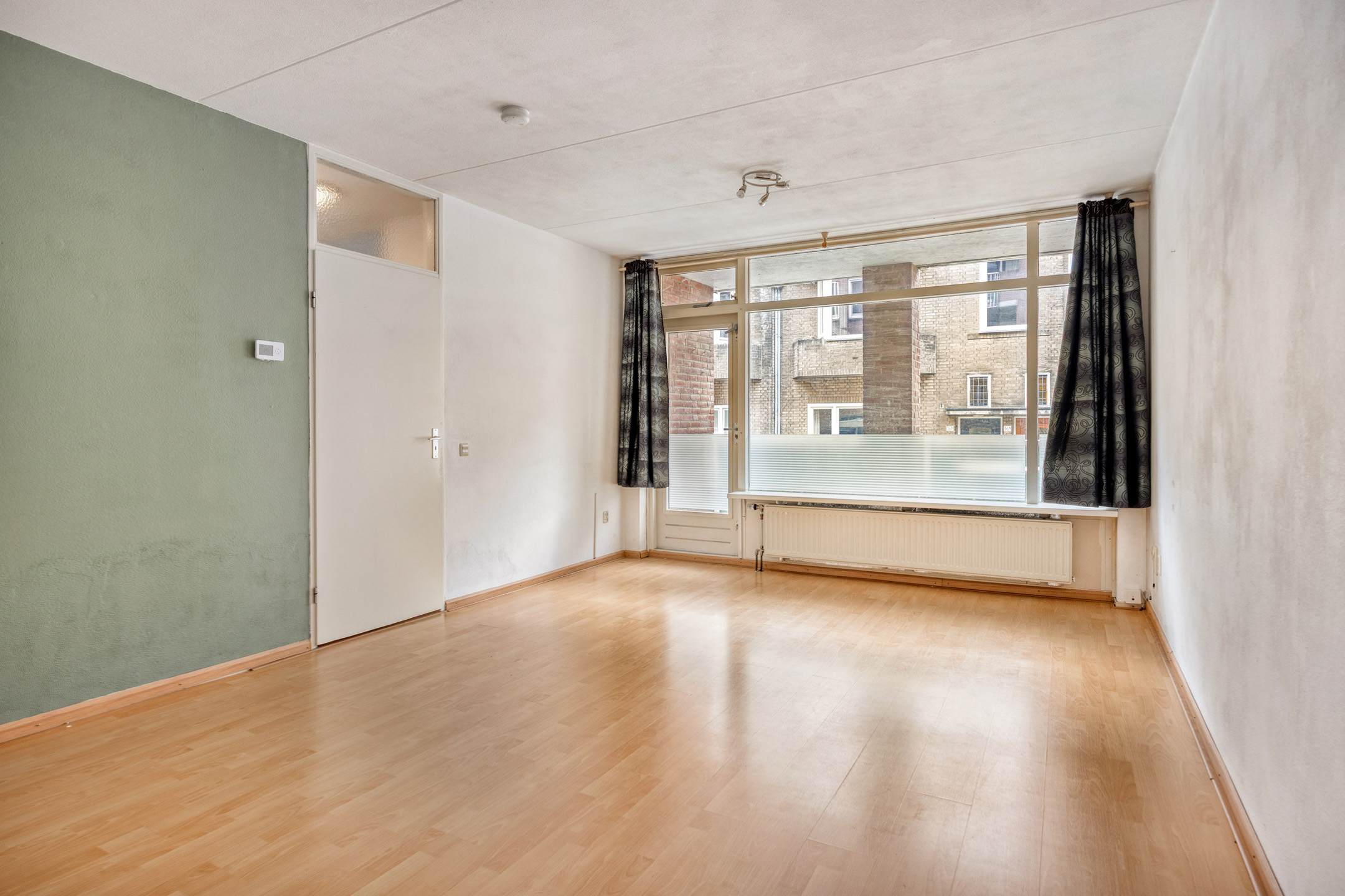De vloer is voorzien van laminaat en er is een groot raamkozijn met loopdeur naar het overdekte balkon.