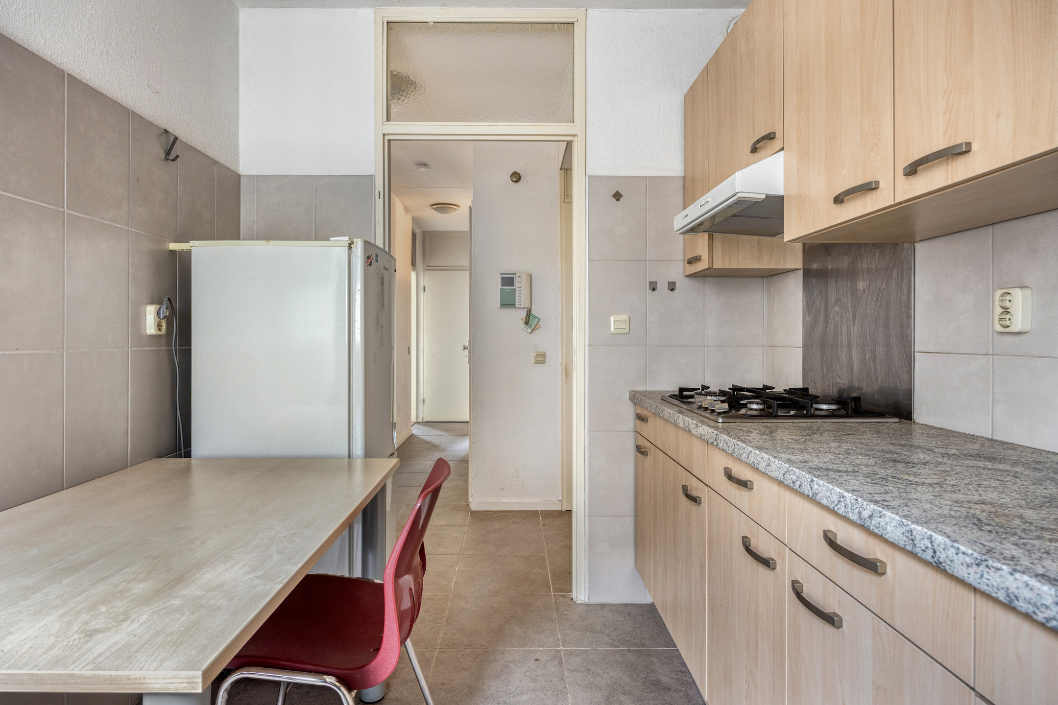 De entree (6m²) met tegelvloer biedt toegang tot de woonkamer, keuken, badkamer en de twee slaapkamers.