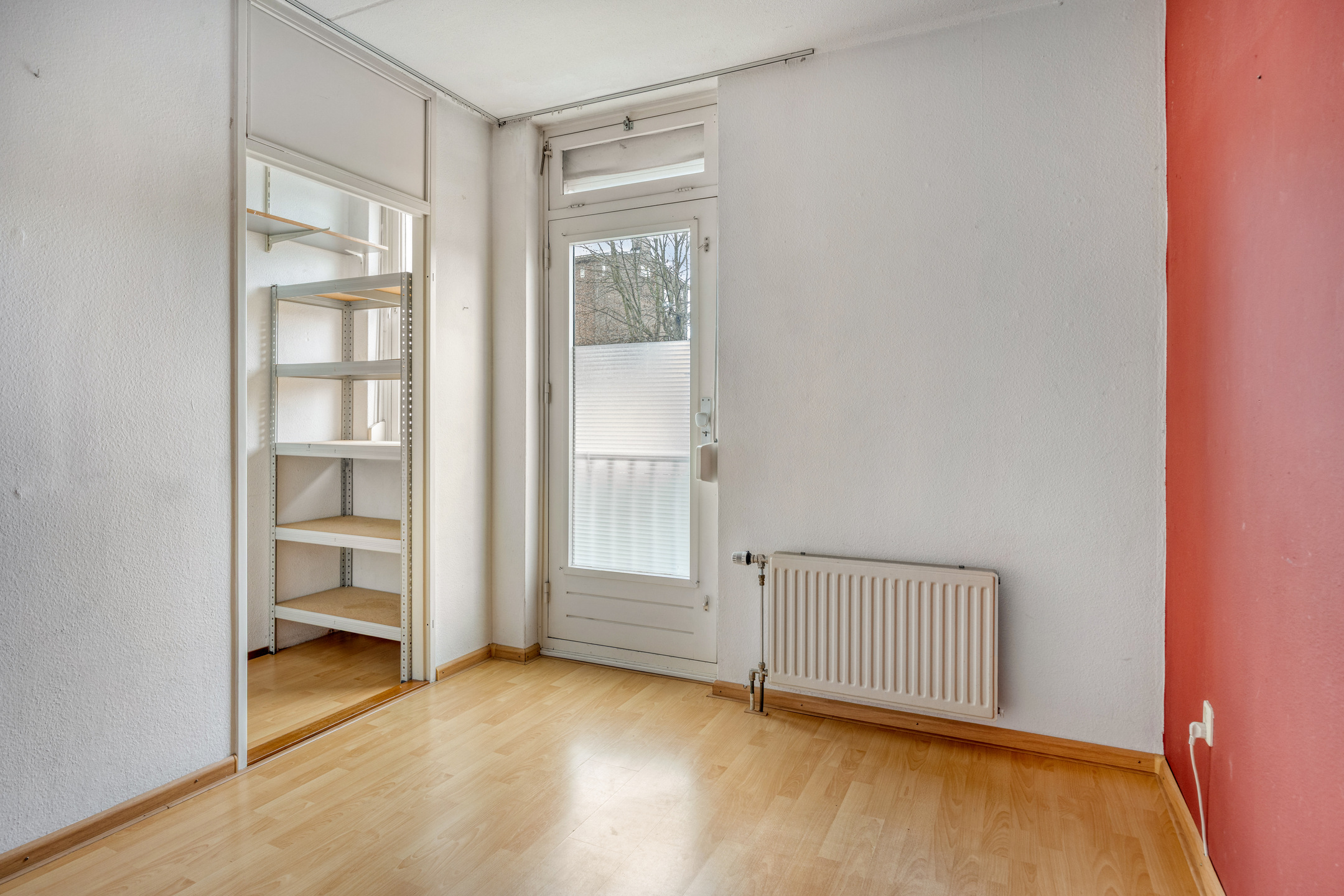 Er is een moderne radiator met thermostaatknop aanwezig en een kledingkast die achterblijft.