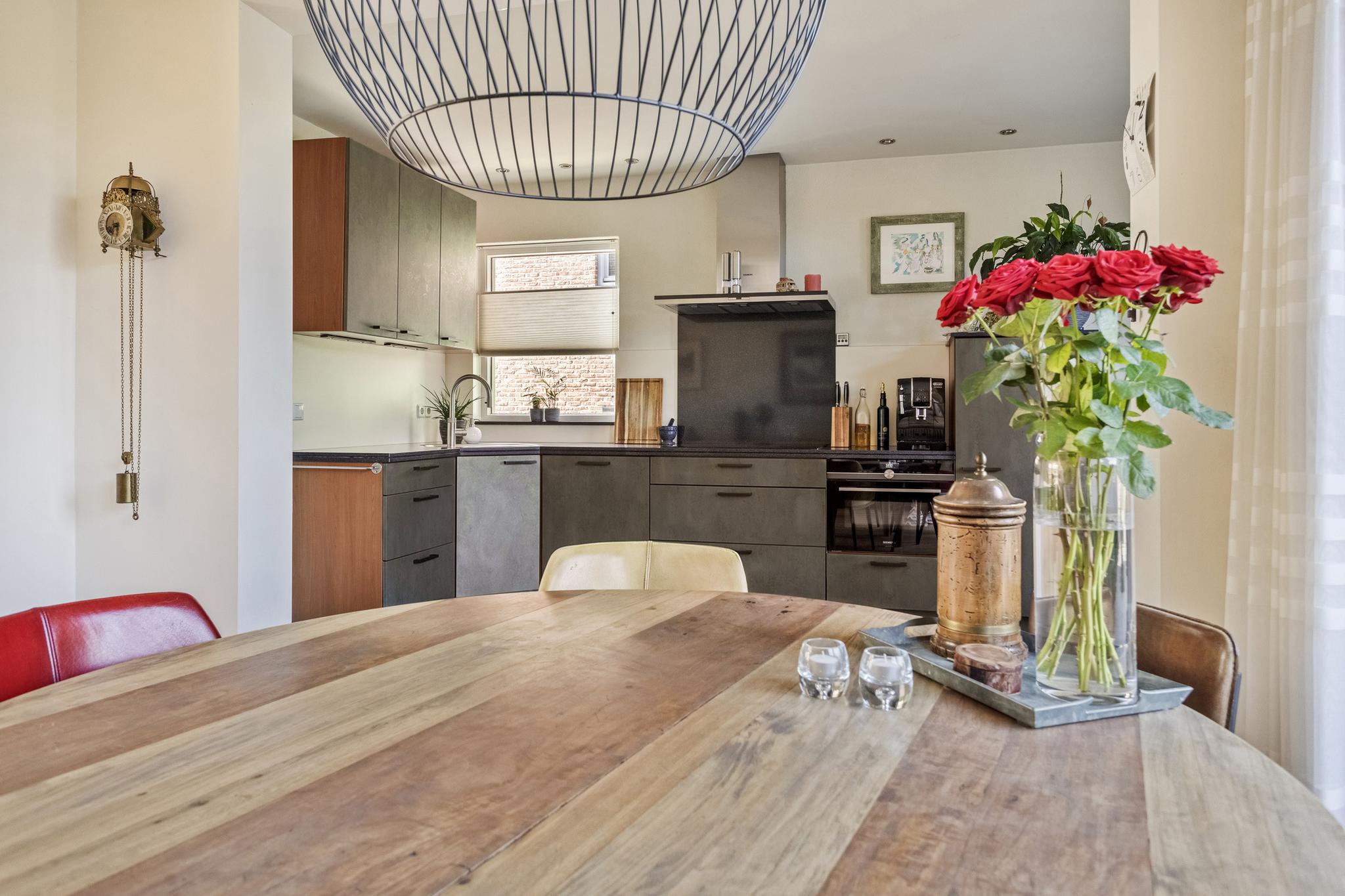 Open keukenruimte van ca. 15 m² voorzien van een duurzame en neutrale aanbouwkeuken afgewerkt met een natuurstenen composiet werkblad en uitgerust met alle comfort waaronder een grote koelkast (2022), vaatwasser (vernieuwd in 2022), combimagnetron/-oven (2023), spoelbak met uitlekbakje, Quooker, inductiekookplaat (2024) en afzuigkap. De fronten van de keuken zijn vervangen. De keuken heeft elektrische vloerverwarming.