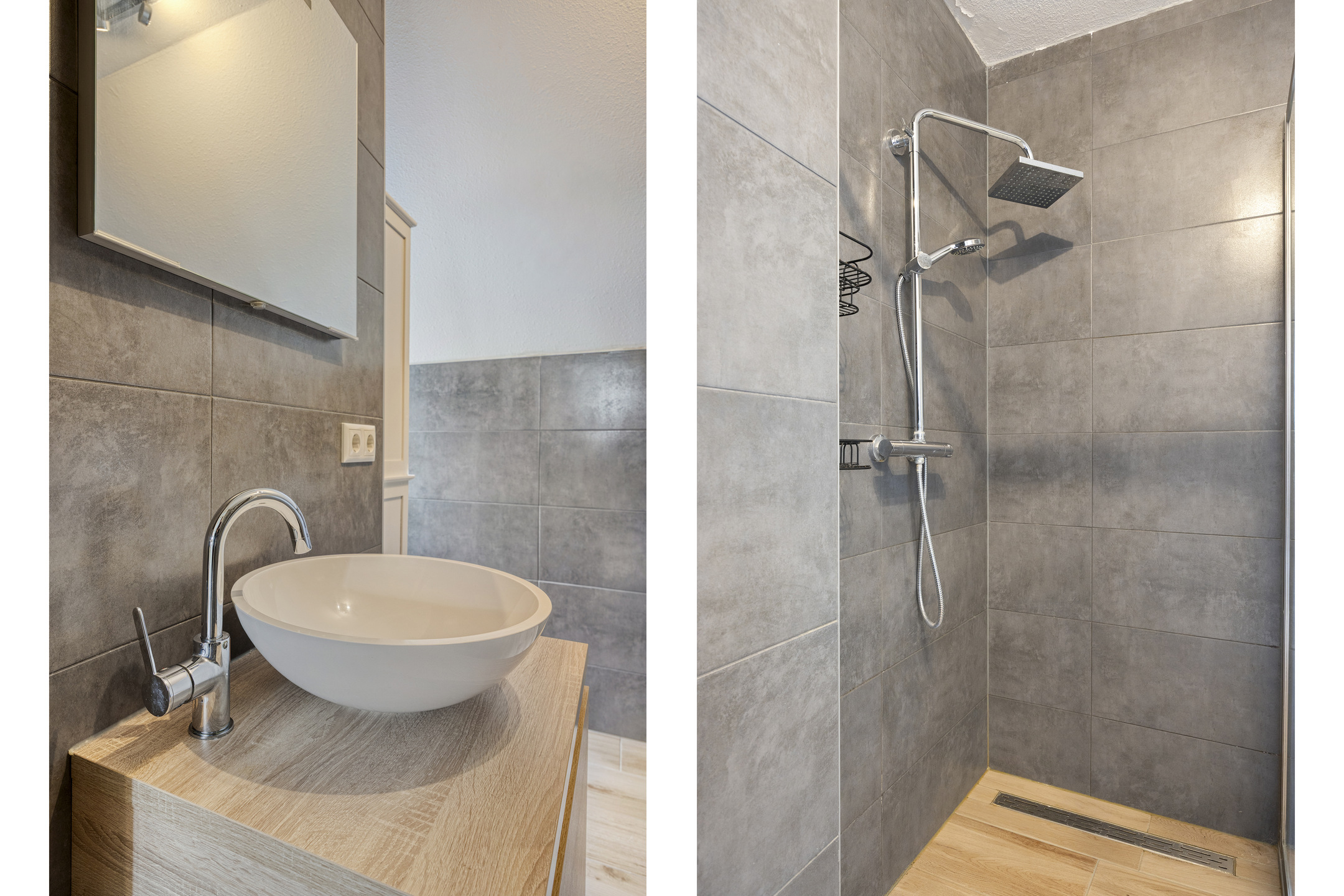 De geheel betegelde moderne badkamer (2021) is uitgevoerd met een inloopdouche, een modern wasmeubel en tweede zwevend toilet.
