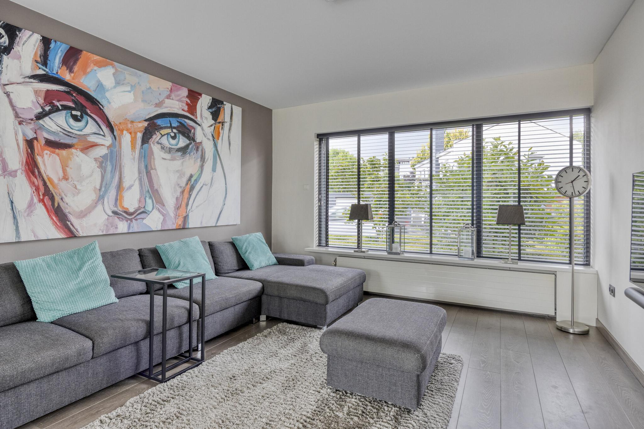 De zeer ruime L-vormige living (meer dan 50m2) heeft optimaal lichtinval door de lichtstraat in de aanbouw en raampartijen over de volle breedte van de woning. De ramen beschikking over elektrische sunscreens