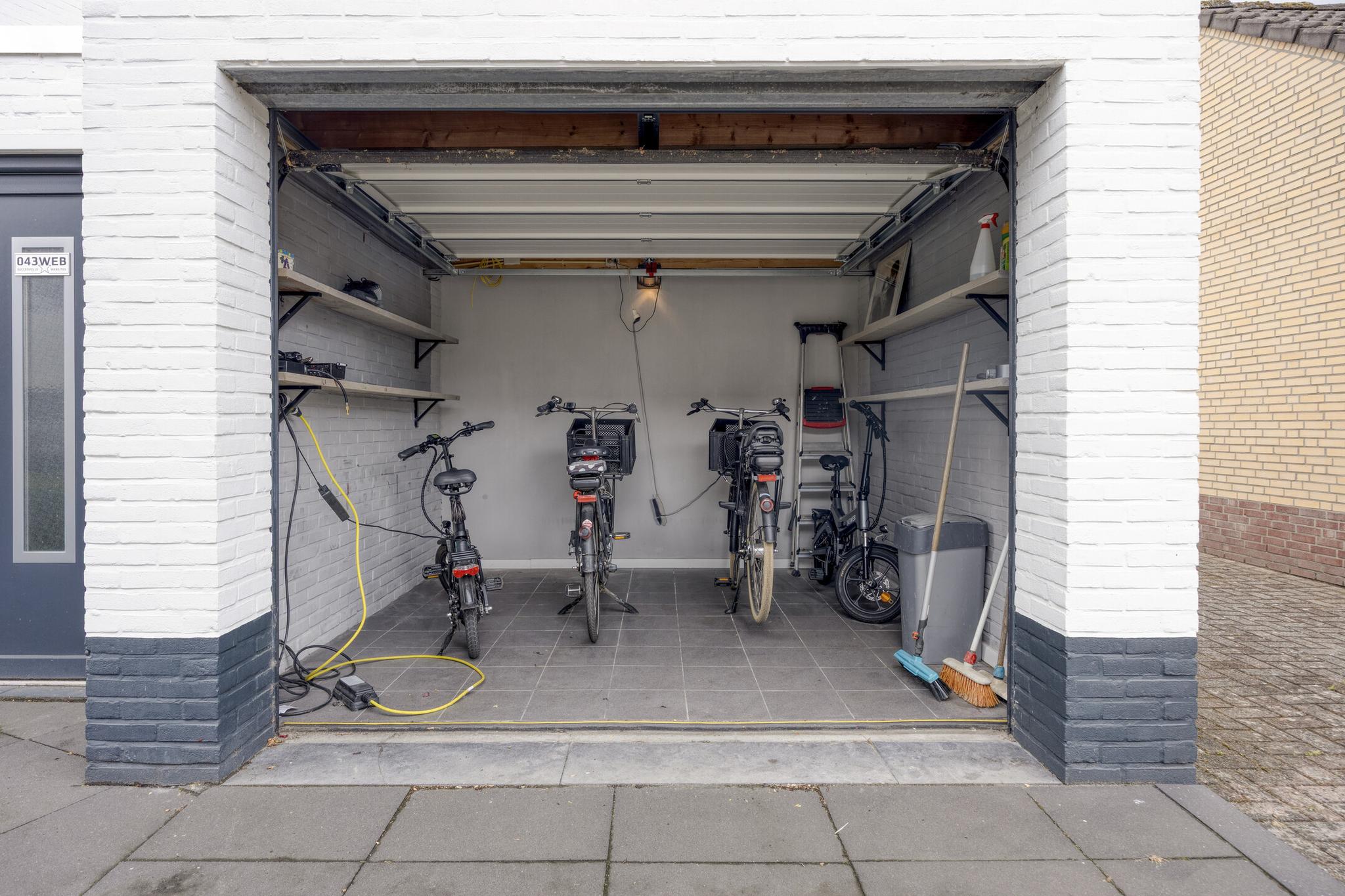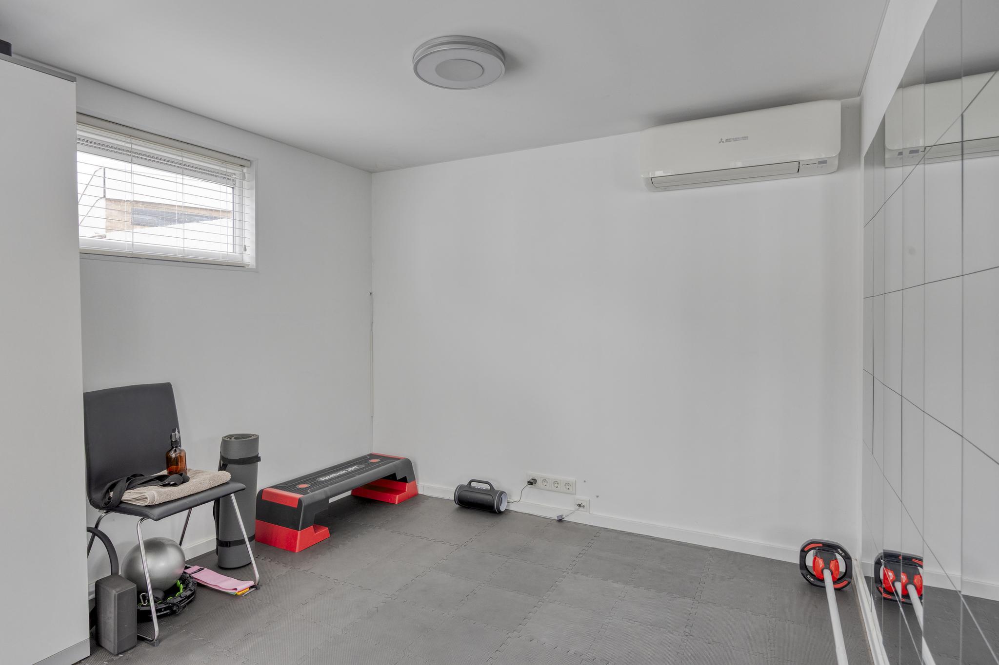 De voormalige garage is nu opgedeeld in sportruimte en fietsenberging met elektrische sectionaalpoort.