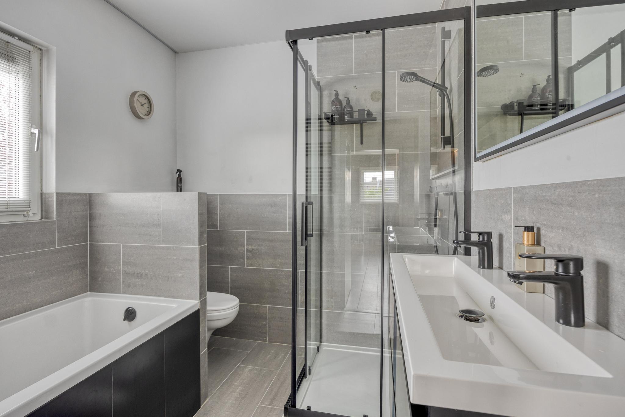 Moderne badkamer (5,3m2) met douche, ligbad, zwevend toilet en dubbel wasmeubel. Er is een elektrische handdoekradiator aanwezig.