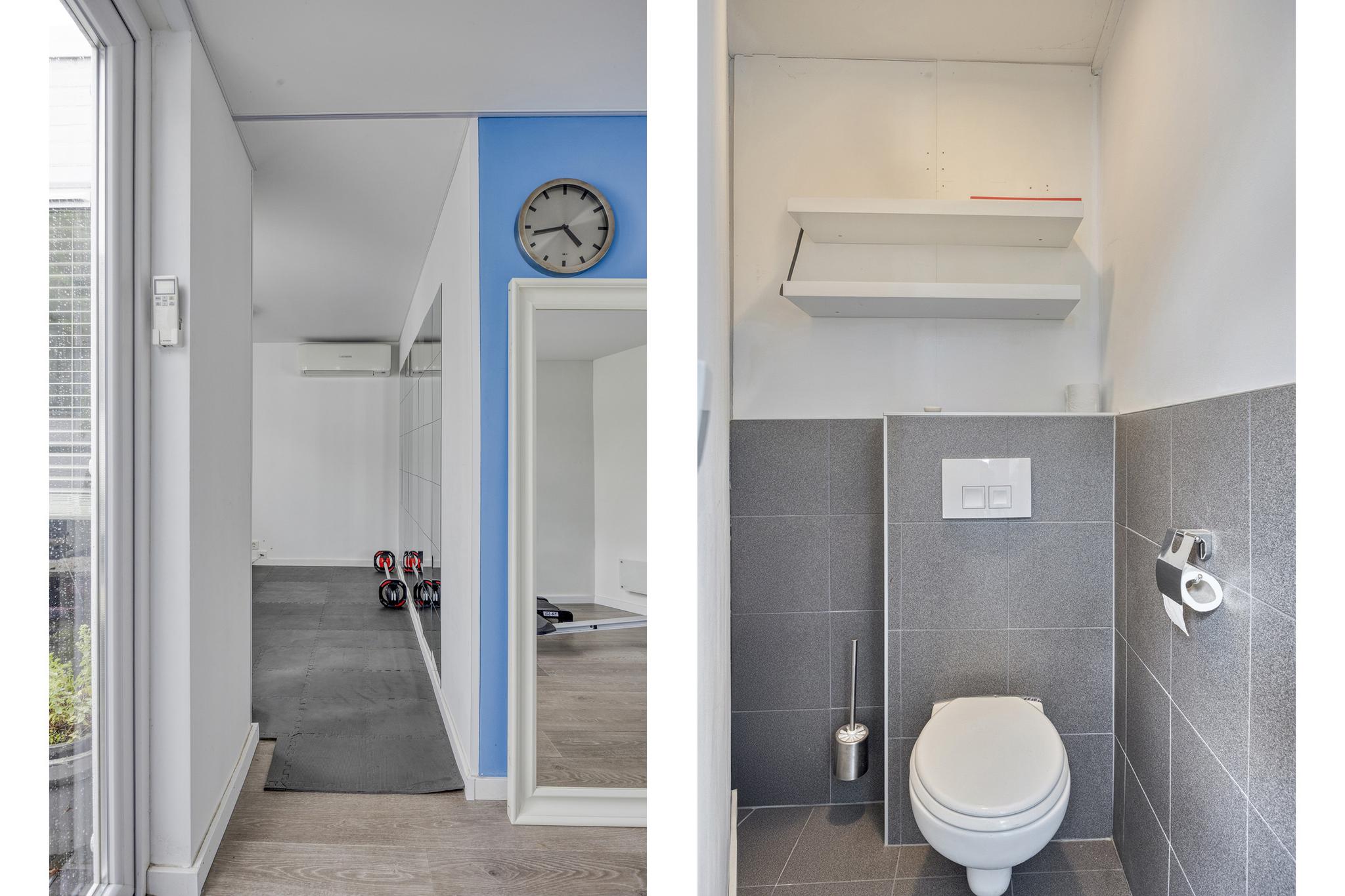 De praktijkruimte (ca 9m2) is bereikbaar vanuit de oprit en achtertuin middels loopdeuren. Er is een toilet aanwezig.