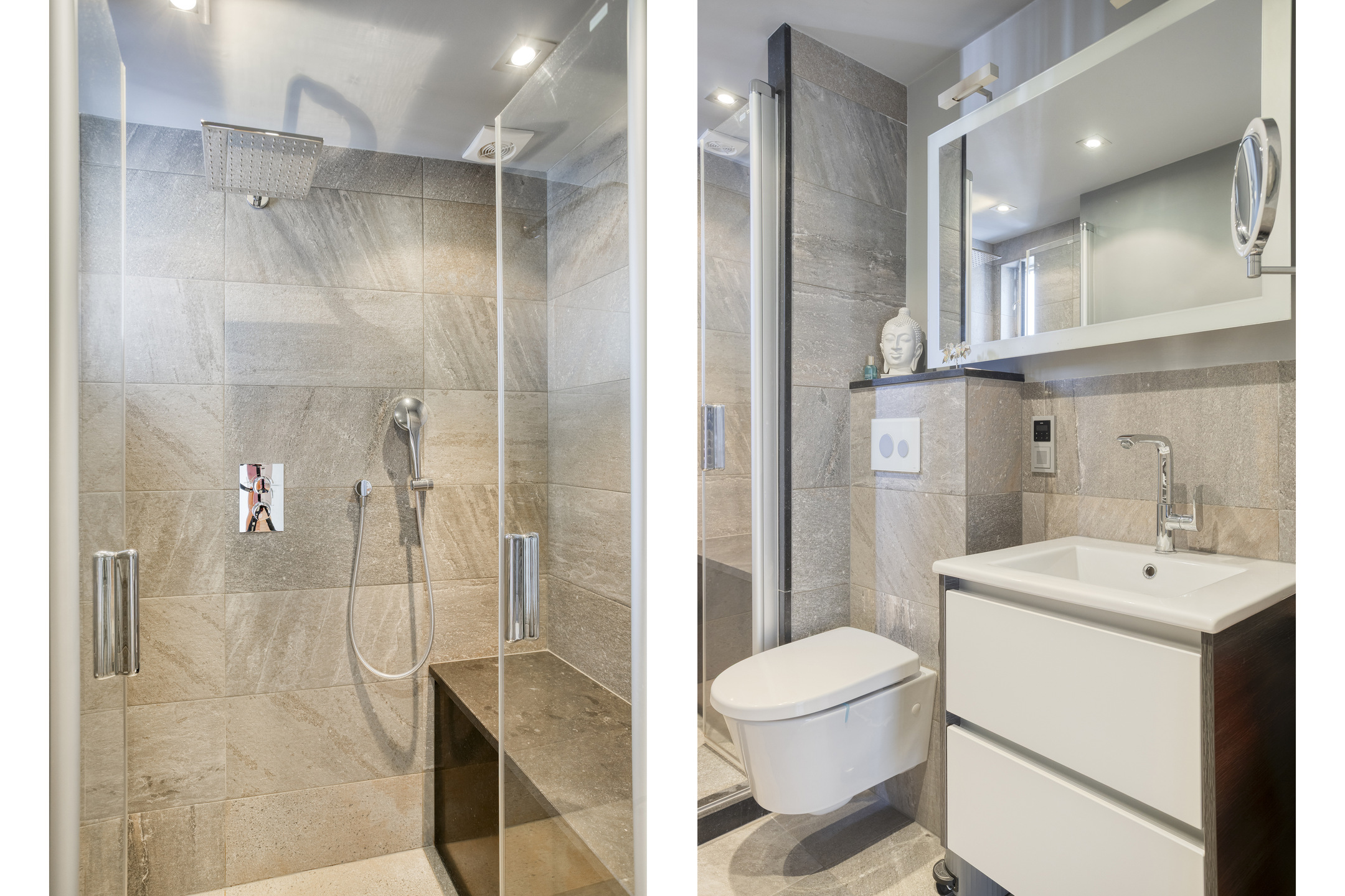 richting de naastgelegen woningen. Badkamer 3 is uitgerust met een design inloopdouche, een toilet en een wasmeubel.