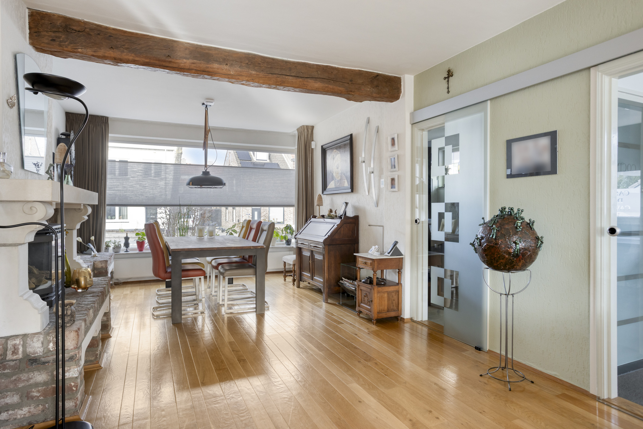 Aan de voorzijde is er volop ruimte voor een grote eettafel, waarbij de aanwezige gaskachel met schouw zorgt voor extra sfeer. Vanuit de eetkamer (ca. 20 m²) heeft u zicht op de voorzijde van de woning richting de Tongerseweg.