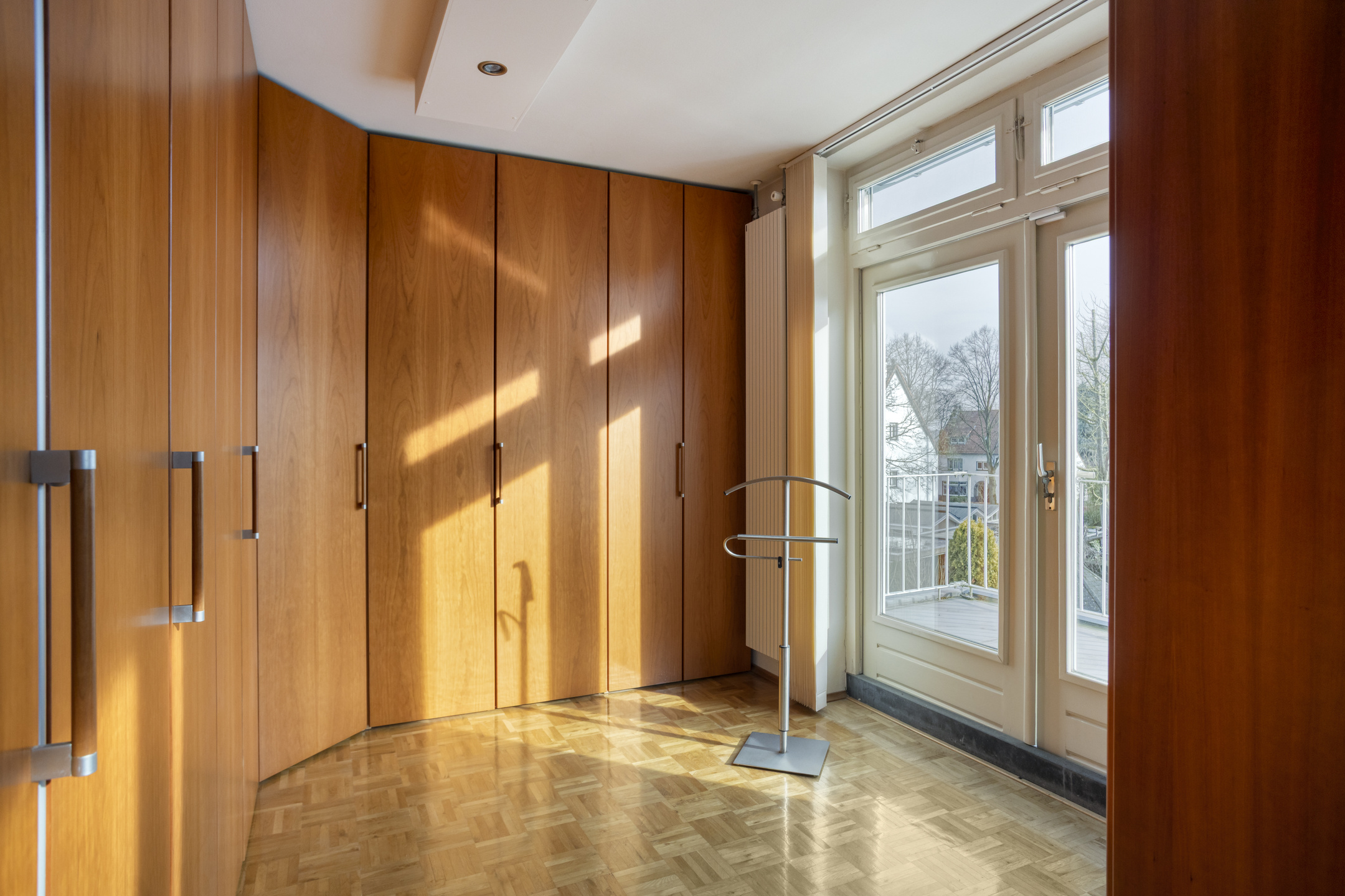 Slaapkamer 2 (ca. 9,5 m²), momenteel in gebruik als walk-in closet, beschikt over een houten deur naar het plat dak.