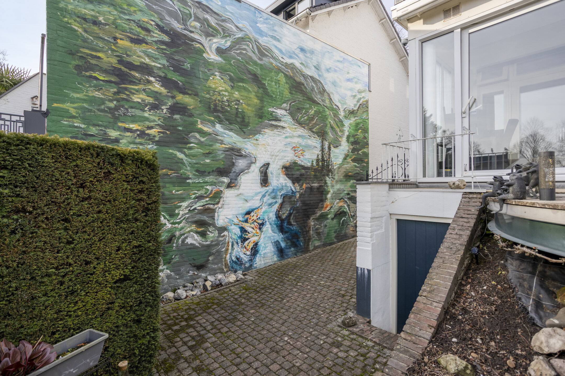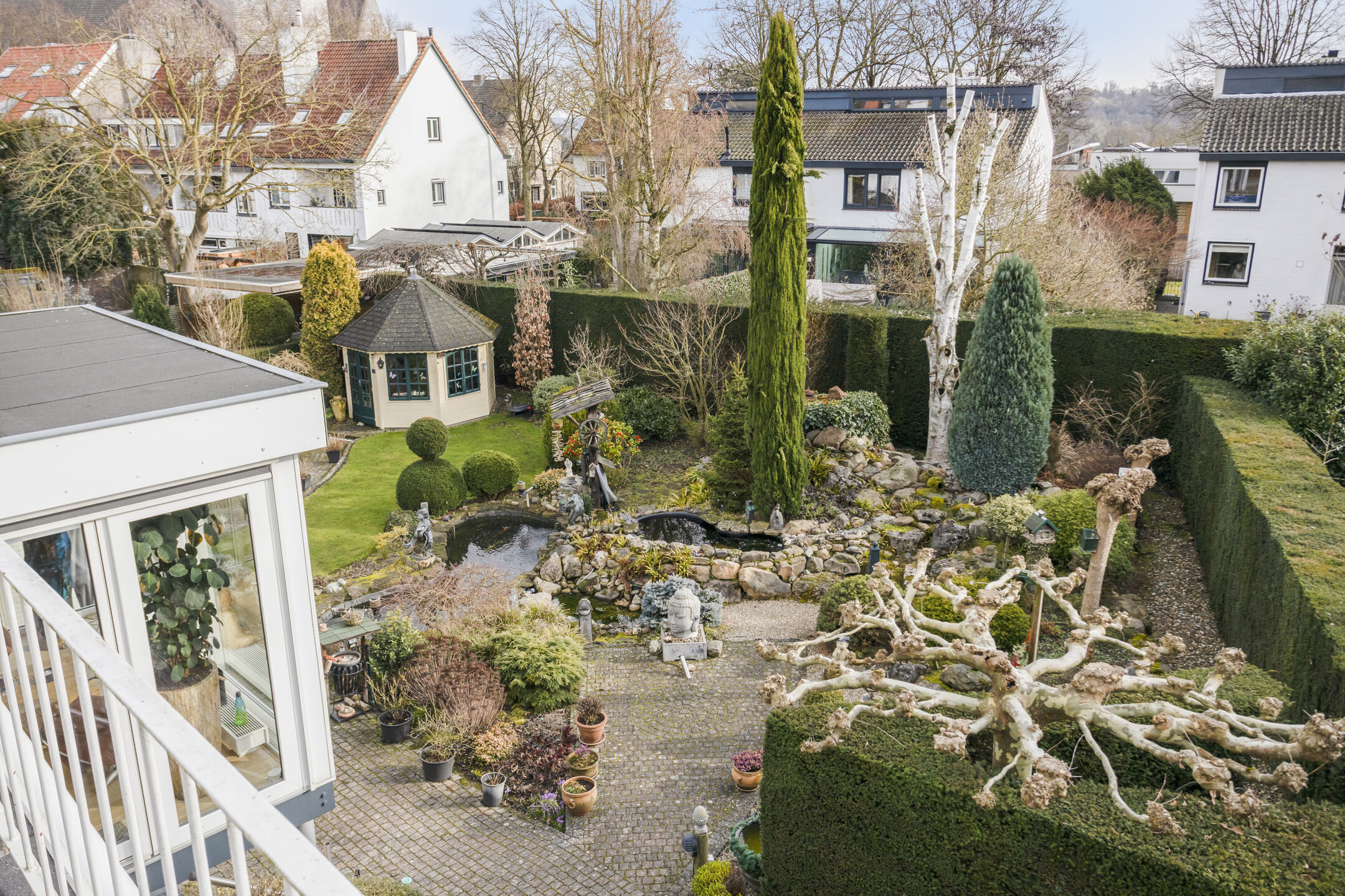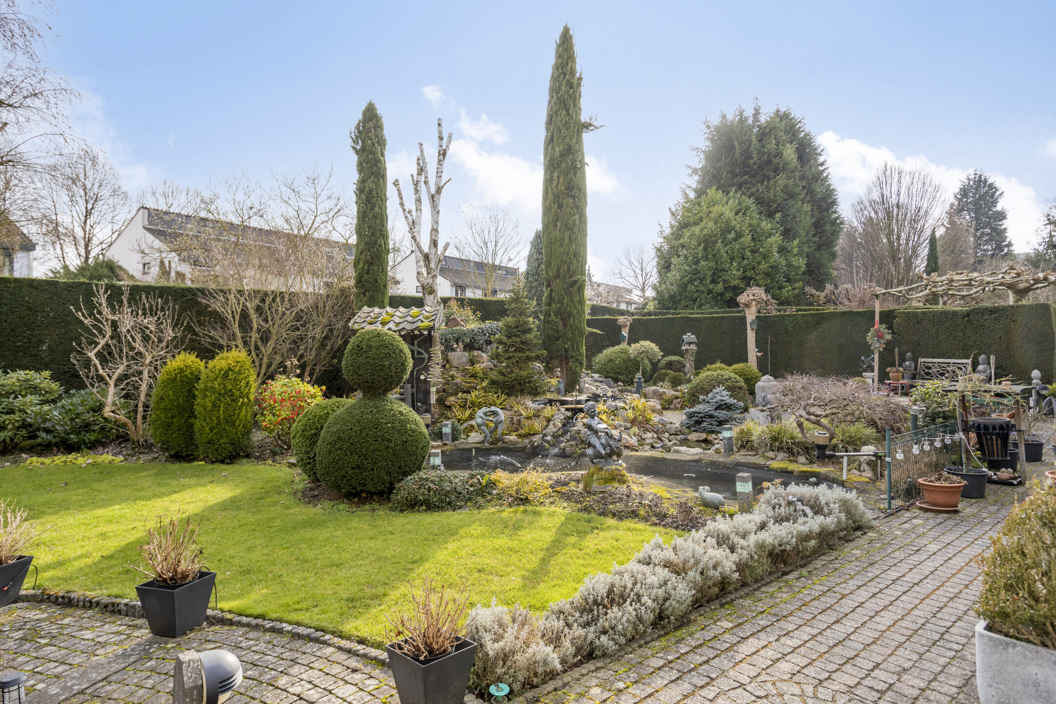 In de tuin bevinden zich, naast twee cipressenbomen, tevens drie vijvers die worden gevoed door een vijverpomp.