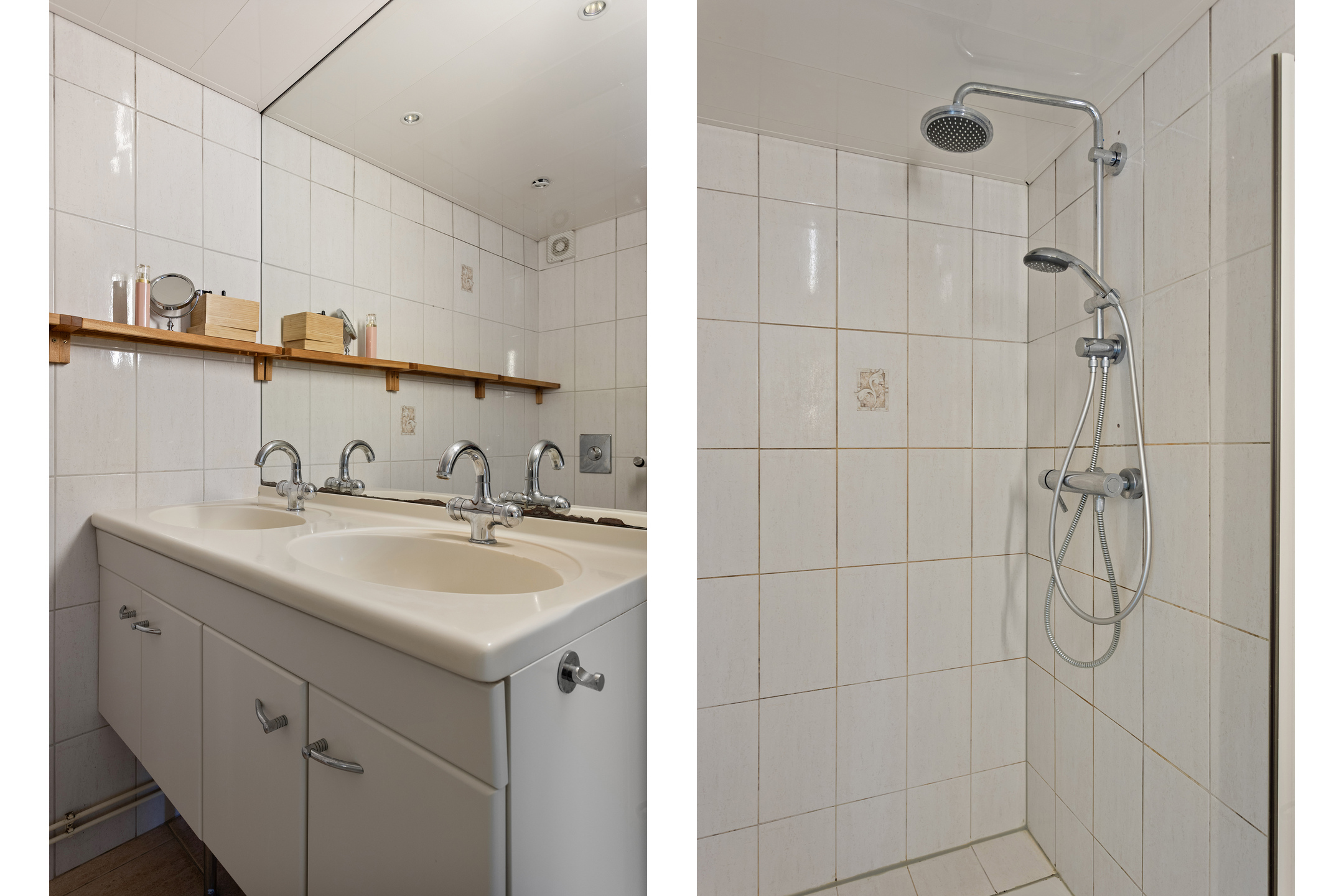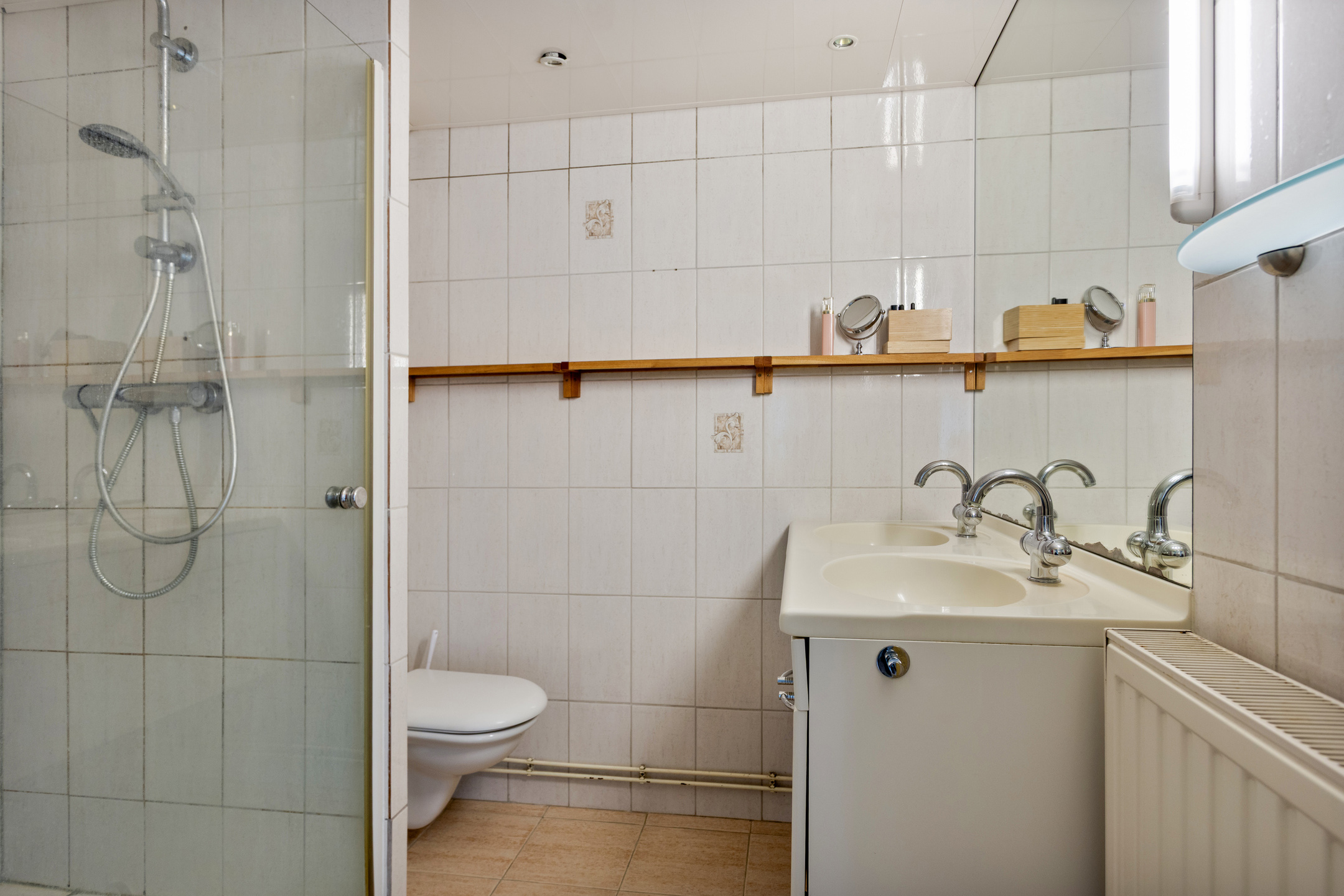 De badkamer (5,5m²) is v.v. een ruime douche, tweede toilet en wastafelmeubel met dubbele wastafel.