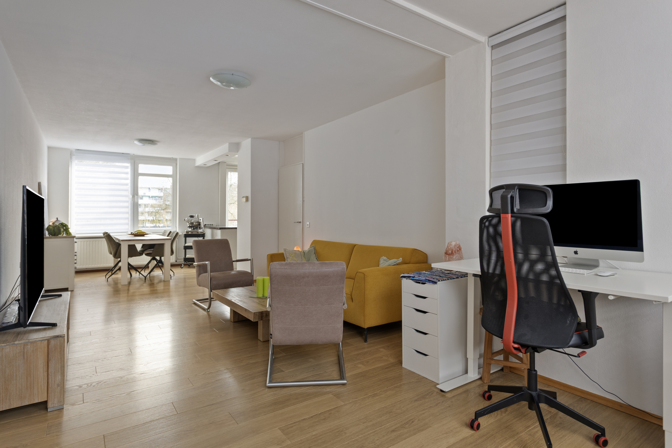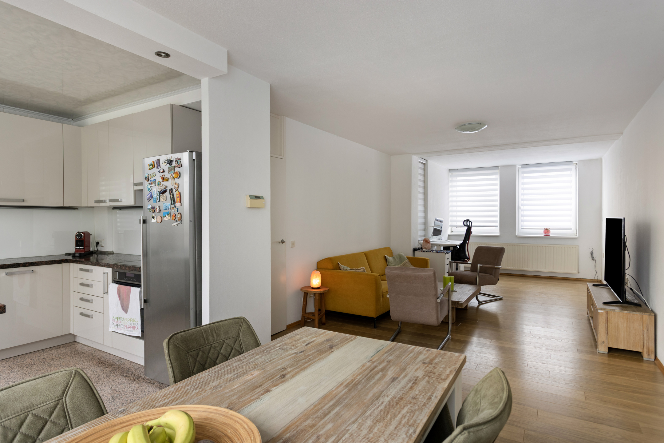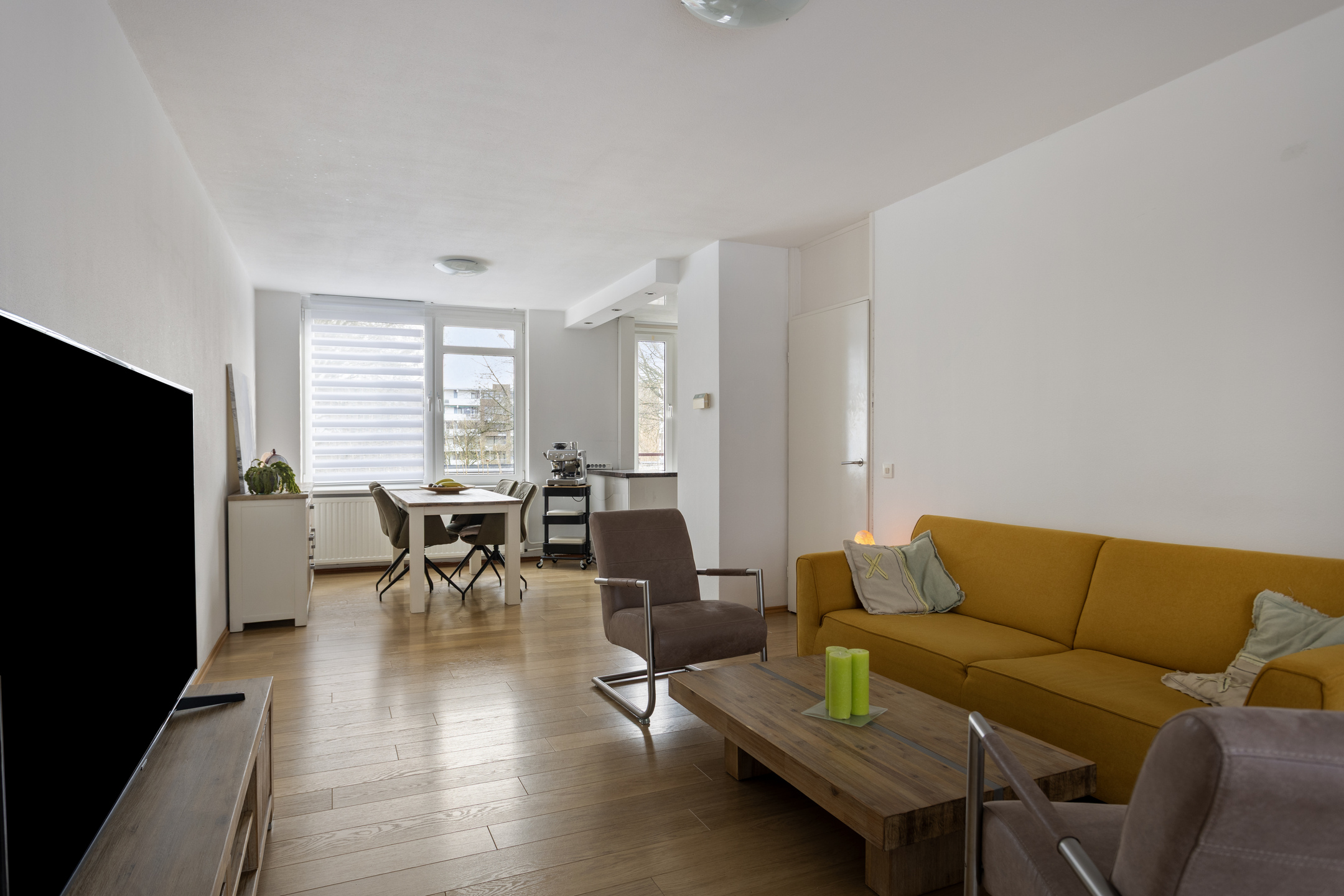 De L-vormige doorzonwoonkamer (36m²) is v.v. een nette laminaatvloer.