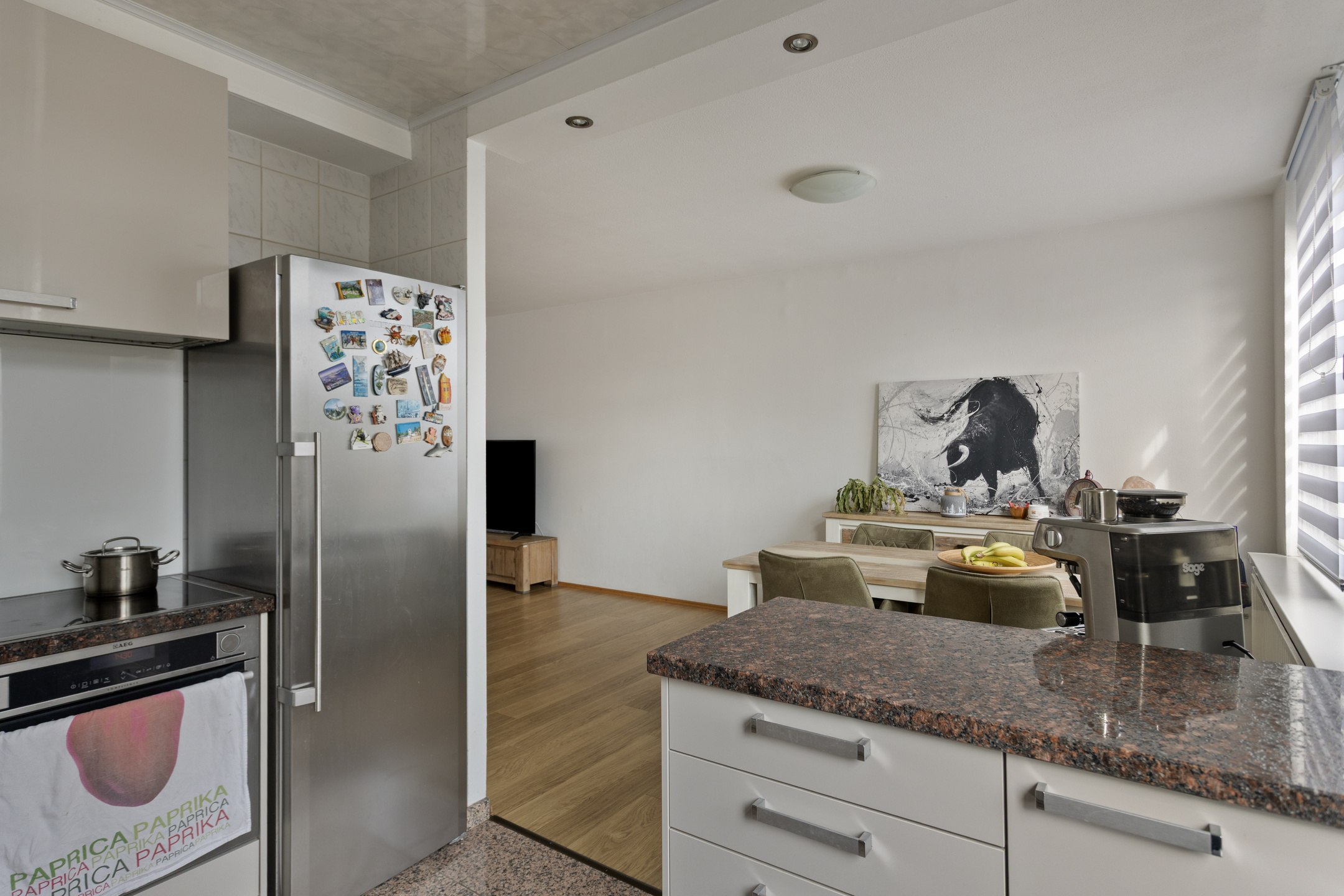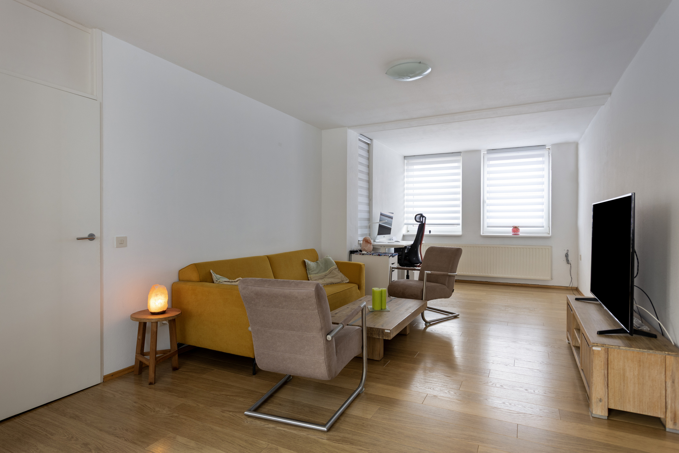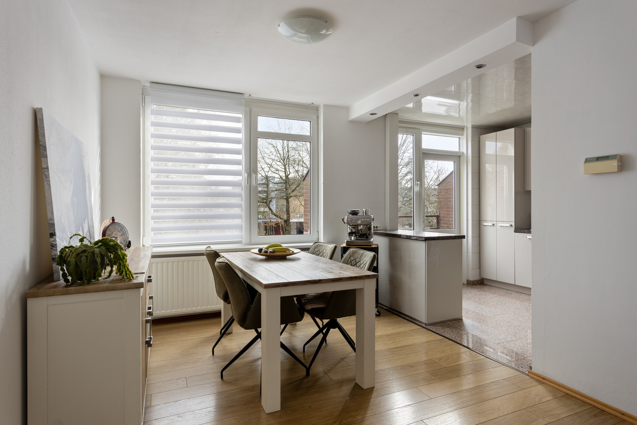 De L-vormige doorzonwoonkamer (36m²) is v.v. een nette laminaatvloer.
