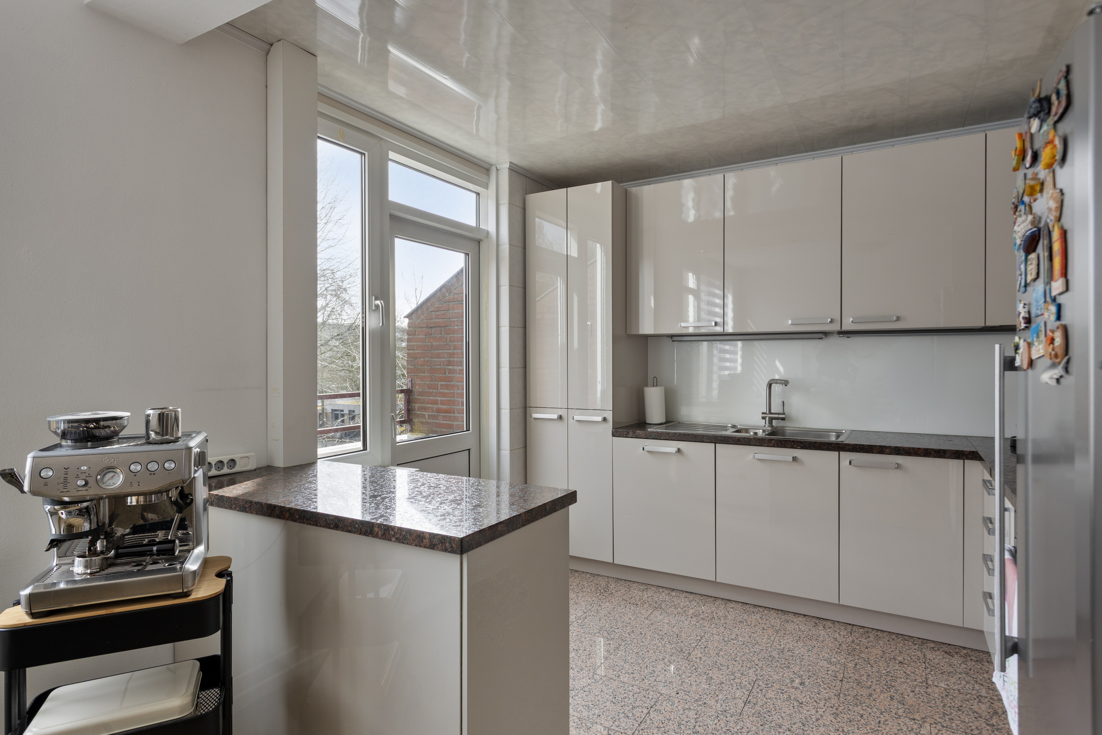 De open en in hoogglans uitgevoerde keuken (8,3m²) beschikt over een marmeren vloer en is geplaatst in hoekopstelling. De hooglans keuken met separaat gelegen barista barretje is v.v. een 4-pits keramische kookplaat,