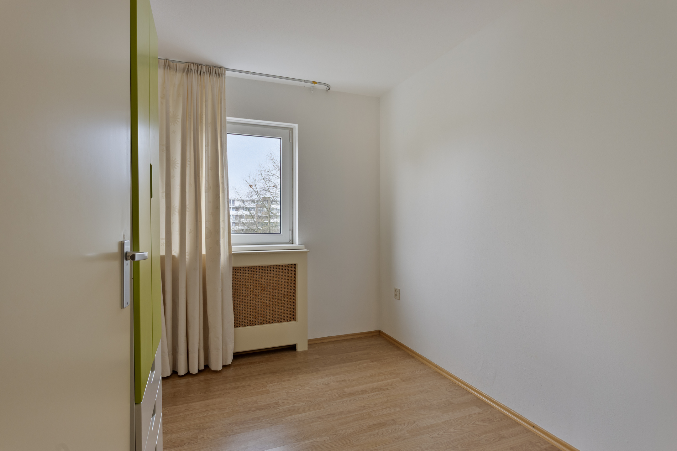 Slaapkamer 3 (9,8m²), gelegen aan de voorzijde met toegang tot het balkon.