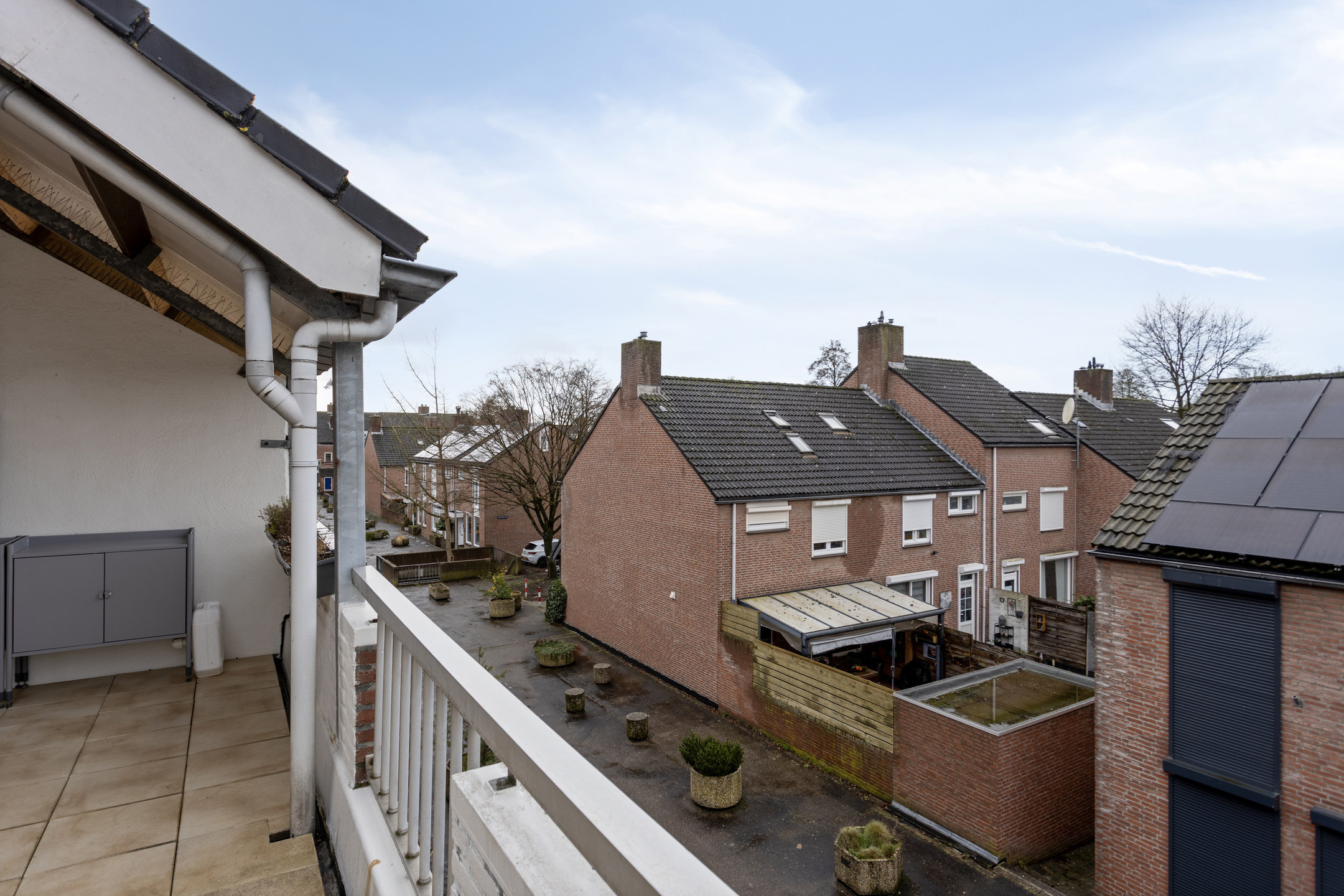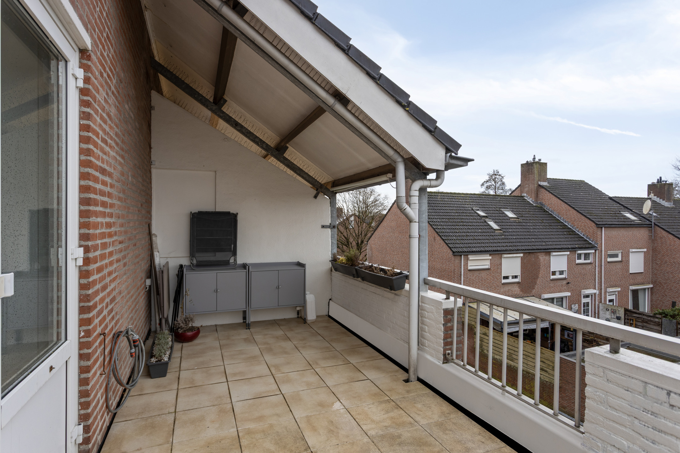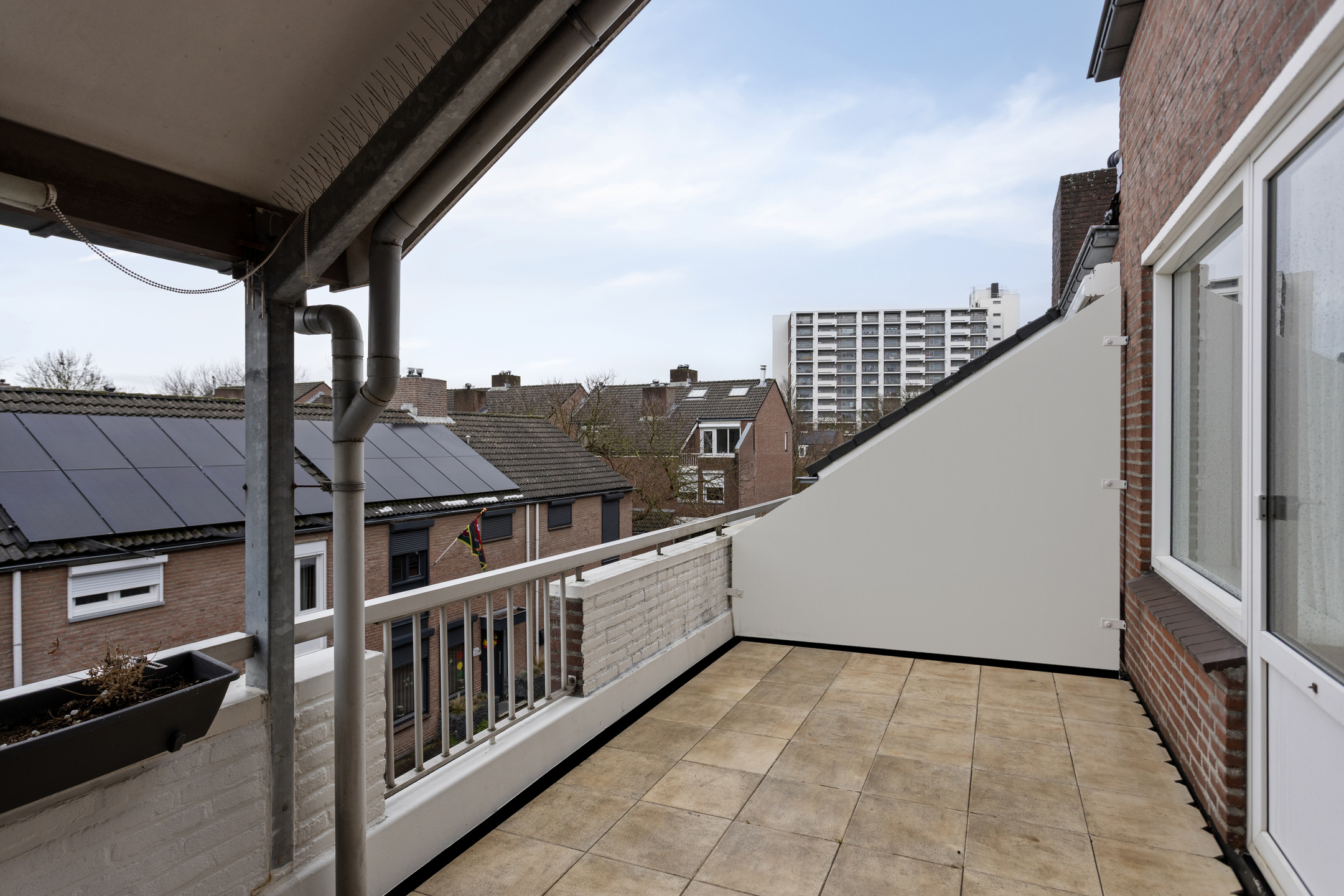 Het deels overdekte balkon is aan de voorzijde gelegen (noordwest) en is ruim van opzet (14,8m²).