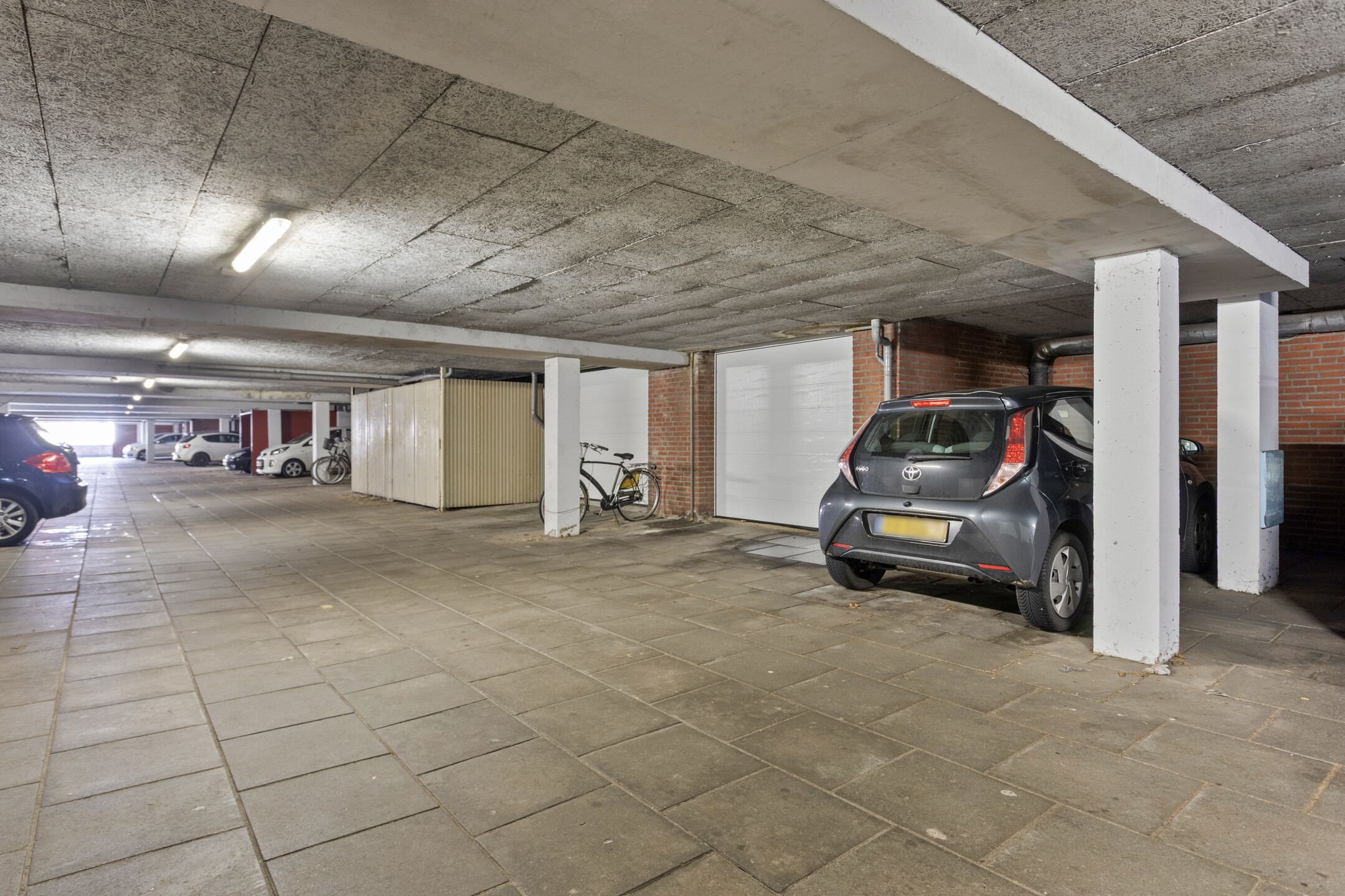 De woning beschikt over een eigen parkeerplaats in de afgesloten parkeergarage in het souterrain.