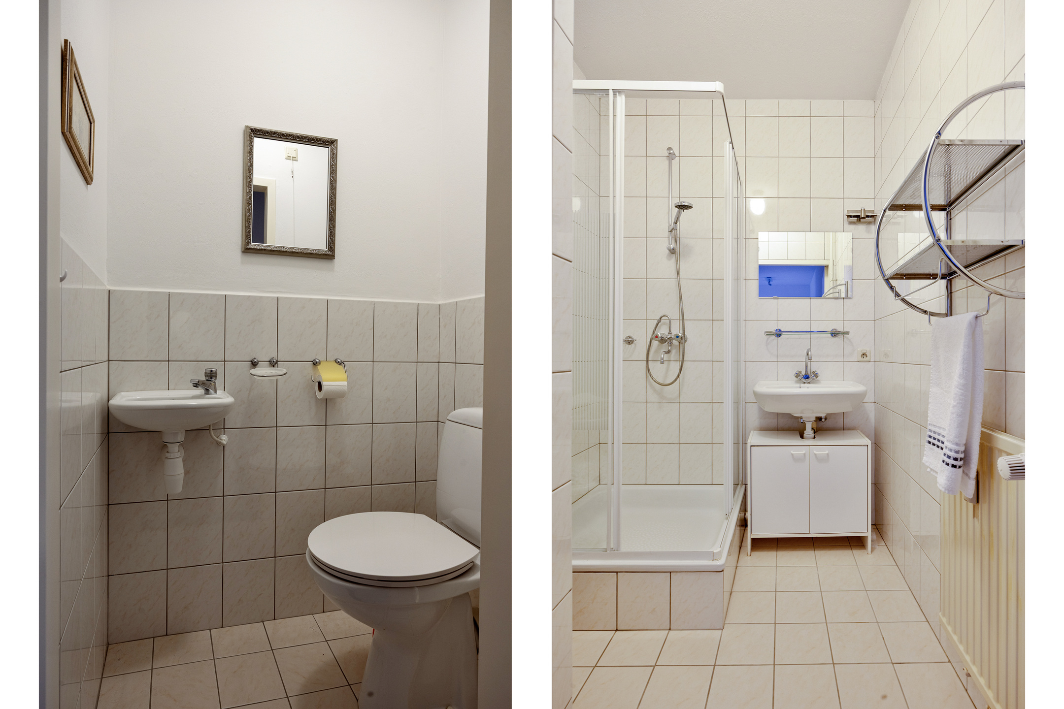 Het toilet (1m²) is deels betegeld en is v.v. een opbouwtoilet met een fonteintje.