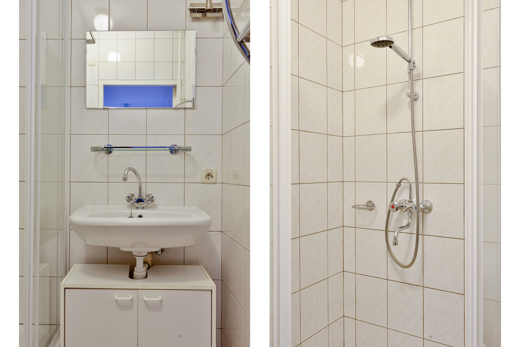 De geheel betegelde badkamer (circa 3m²) is v.v. een douchecabine een wasmeubel met een wastafel.
